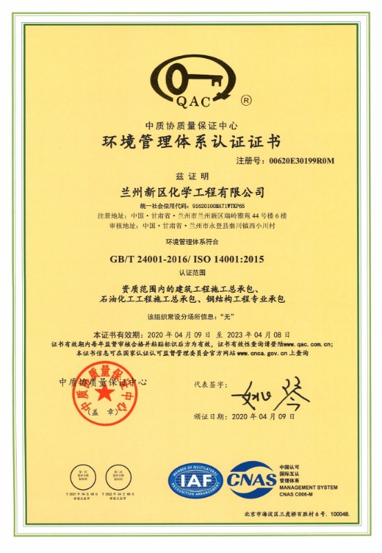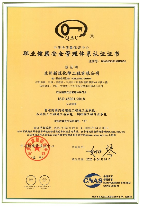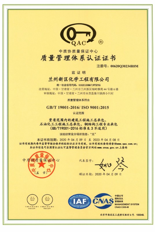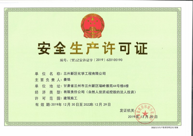 兰州新区化学工程有限公司目前已取得了石油化工总承包三级、建筑工程总承包三级、钢结构专业承包三级、地基处理专项承包三级资质。
