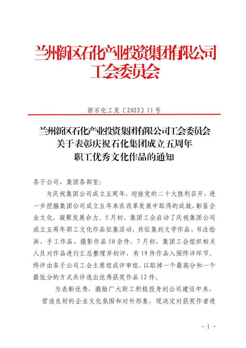 k8凯发天生赢家一触即发工会委员会 关于表扬庆祝k8凯发天生赢家一触即发集团建立五周年 职工优秀文化作品的通知